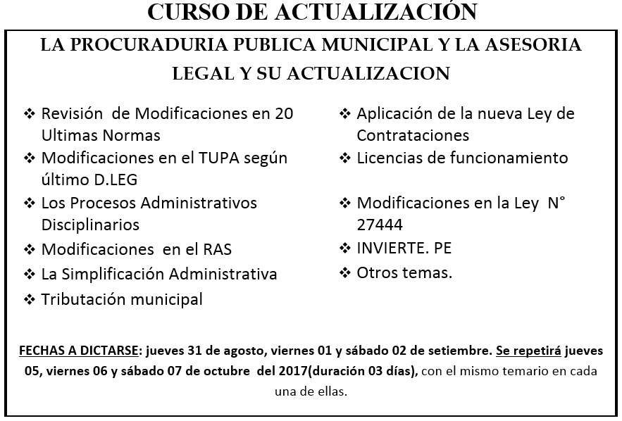IMPORTANTE : Favor de comunicar su participación a la brevedad por razones de cupo, así mismo las Municipalidades que tienen Contrato de Capacitación a Costo Fijo podrán acreditar en este evento hasta 02 participantes sin costo alguno.