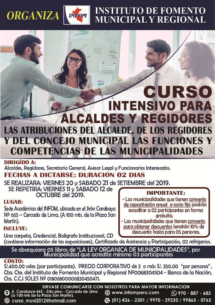IMPORTANTE : Favor de comunicar su participación a la brevedad por razones de cupo, asimismo las Municipalidades que tienen Contrato de Capacitación a Costo Fijo podrán acreditar en este evento hasta 02 participantes sin costo alguno.