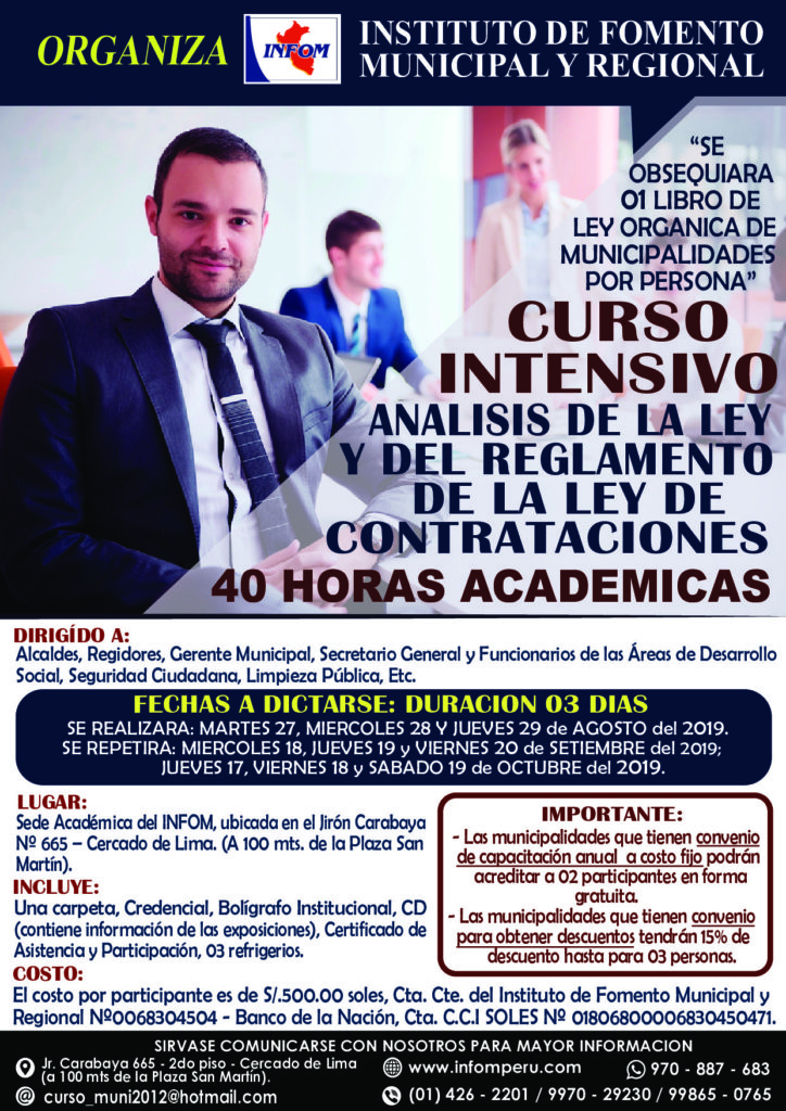 IMPORTANTE : Favor de comunicar su participación a la brevedad por razones de cupo, asimismo las Municipalidades que tienen Contrato de Capacitación a Costo Fijo podrán acreditar en este evento hasta 02 participantes sin costo alguno.