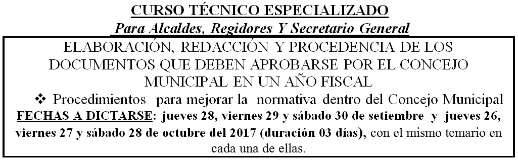 IMPORTANTE : Favor de comunicar su participación a la brevedad por razones de cupo, así mismo las Municipalidades que tienen Contrato de Capacitación a Costo Fijo podrán acreditar en este evento hasta 02 participantes sin costo alguno.