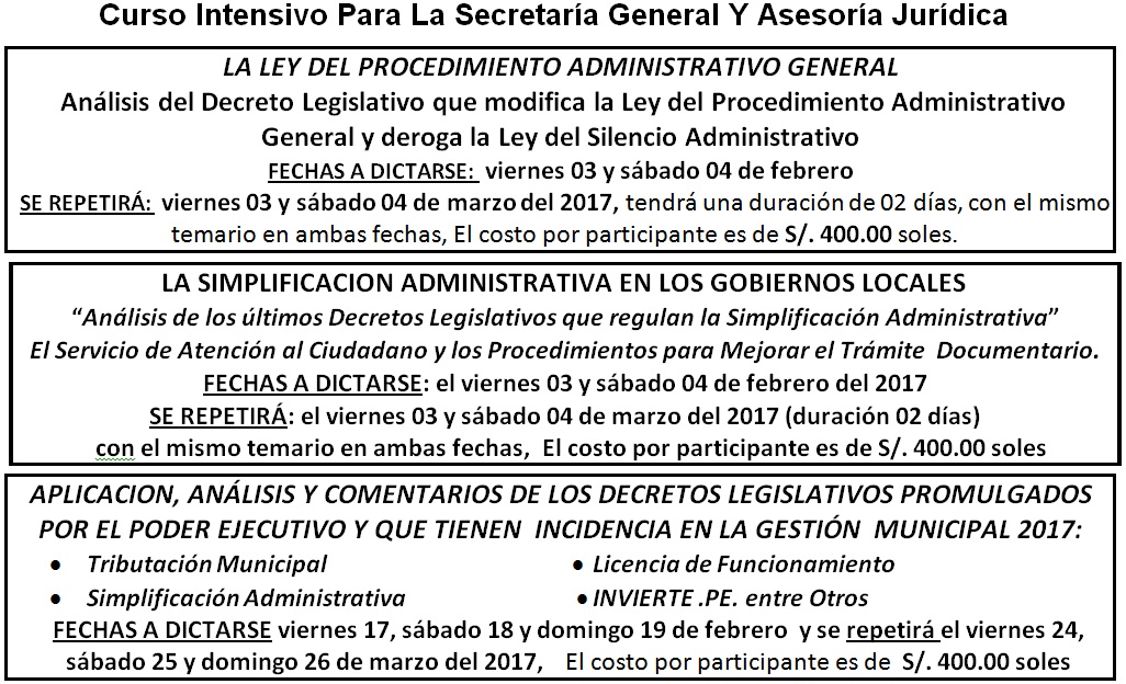 IMPORTANTE : Favor de comunicar su participación a la brevedad por razones de cupo, así mismo las Municipalidades que tienen Contrato de Capacitación a Costo Fijo podrán acreditar en este evento hasta 02 participantes sin costo alguno.