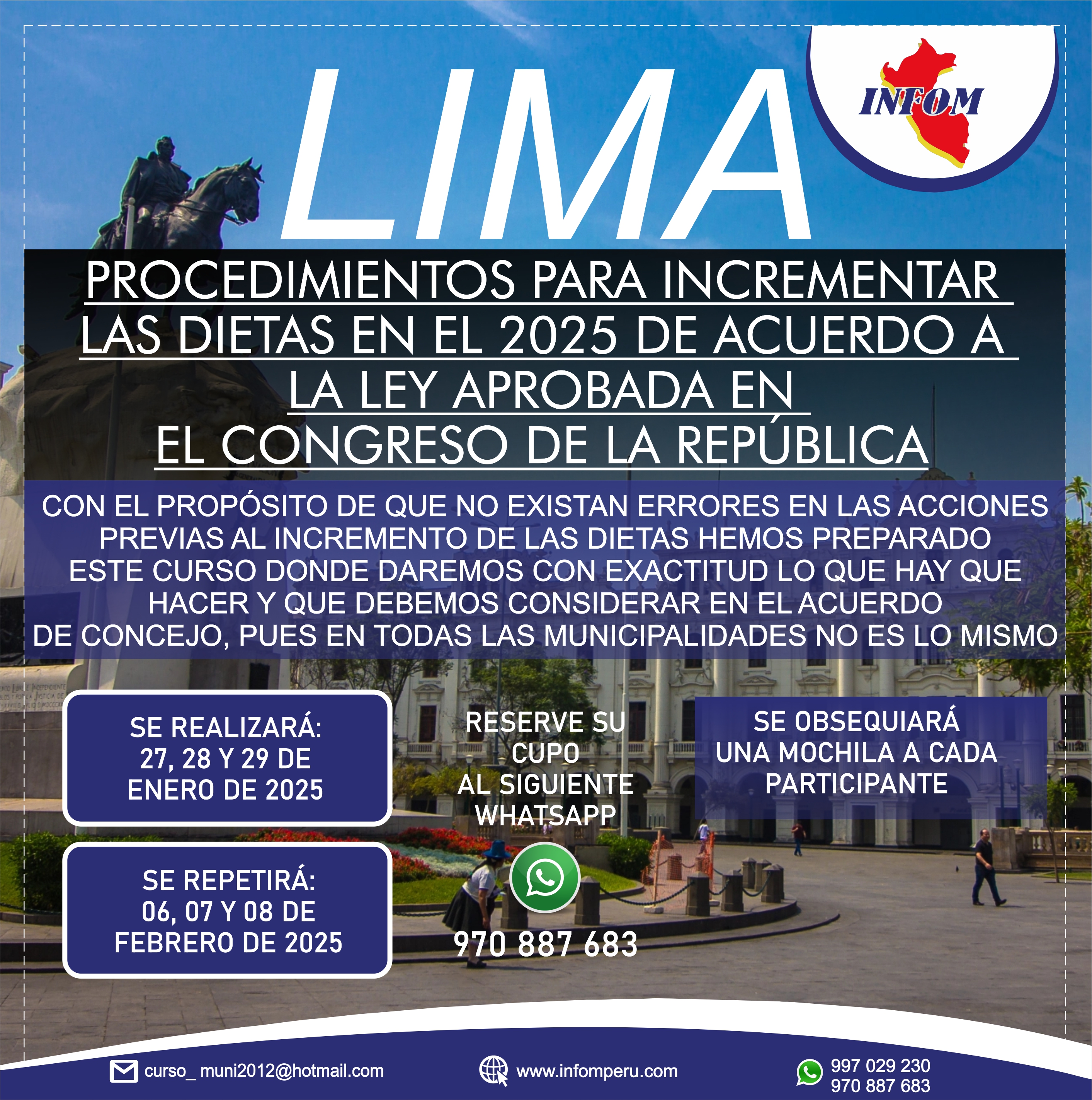 CURSO – TALLER ESPECIALIZADO PROCEDIMIENTOS PARA INCREMENTAR LAS DIETAS EN EL 2025 DE ACUERDO A LA LEY APROBADA EN EL CONGRESO DE LA REPÚBLICA